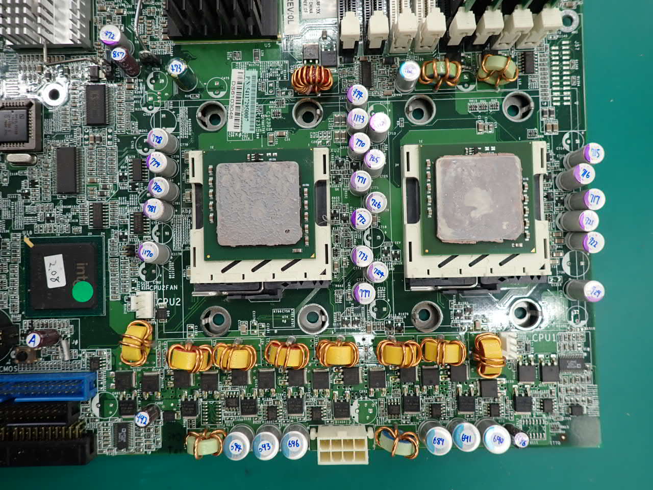正常に起動しないということで、電源を疑います。 既に、お客様にて電源ユニットは交換されている様でしたので、マザーボードの寿命部品(電解コンデンサ)の交換をご提案しました。 製造から15年以上経過しておりますので、電解コンデンサは完全に寿命を迎えております。 ビジネス用途に使用されるワークステーションだけに、大量の電解コンデンサが実装されています。 作業の際は、実装されいているCPUやメモリカード、その他のコネクタ・部品は全て取り外します。 昨今、デュアルコアやクアッド・シックスコアのCPUは当たり前になりましたが、デュアルCPUは珍しいです。 しかも、Xenonプロセッサー。 大量の電解コンデンサを交換して組み立てます。