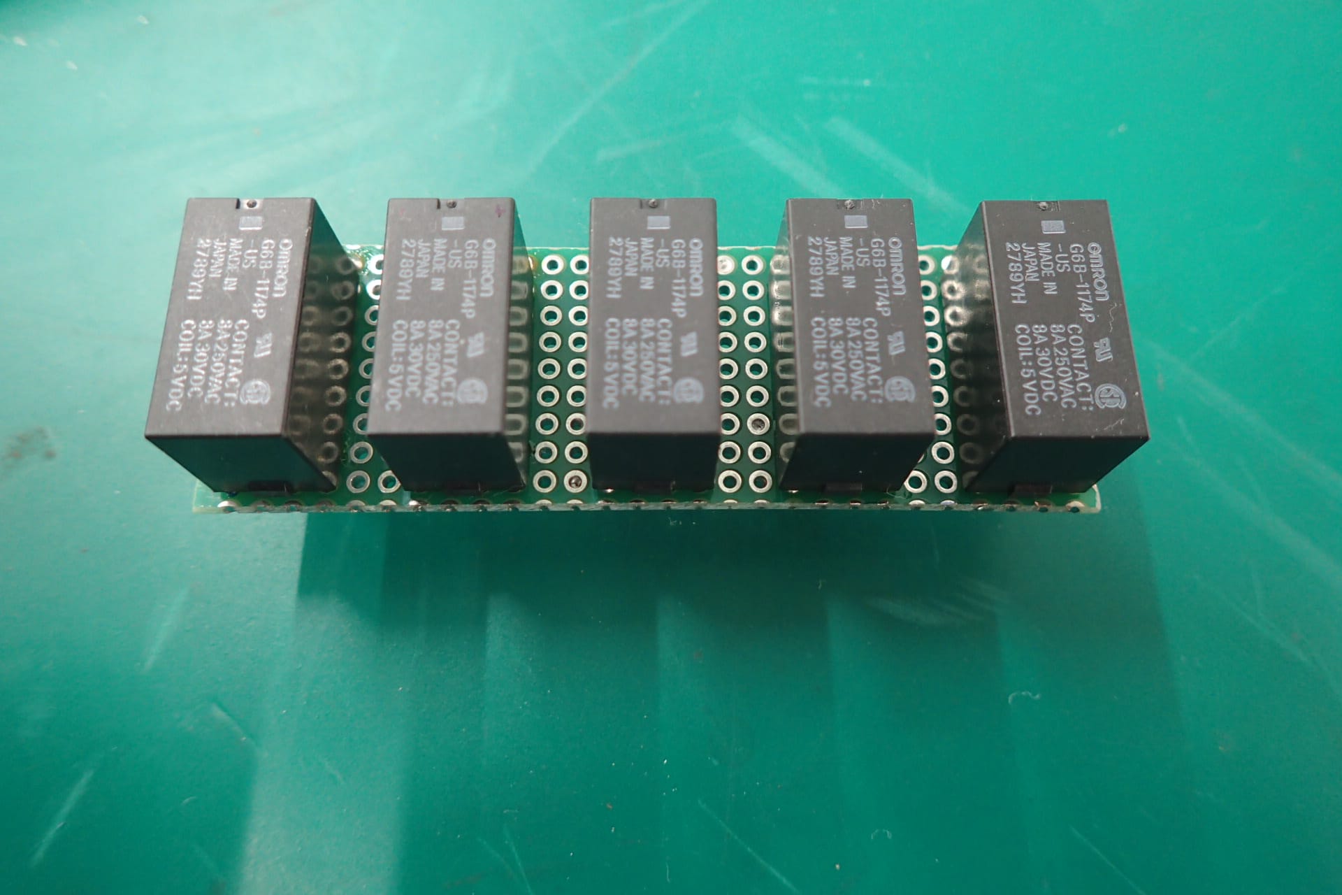 寿命部品(電解コンデンサ・バックアップバッテリー・リレー)を取り外していきます。 製造から20年以上経過しているため、電解コンデンサは容量抜けしております。 問題は、5つあるリレーの交換になります。 部品が古いために、入手ができません。 メーカの後継部品を検討しますが、ピンアサインが異なるために、そのままだと実装ができません。 そのため、ユニバーサル基板を使ってピンアサインを変更する変換基板を自作しました。