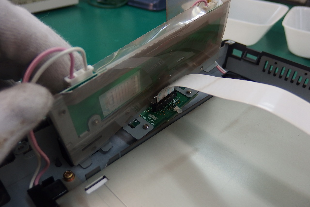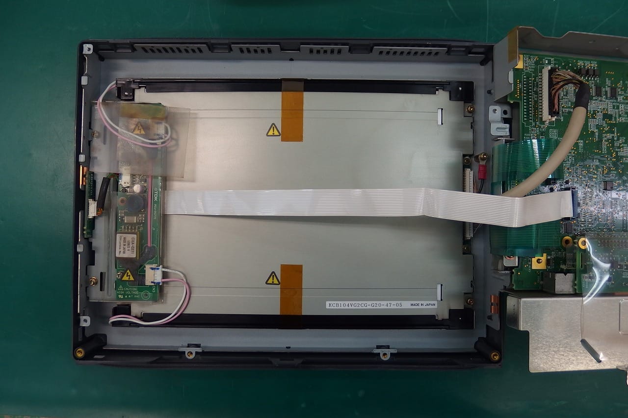 調査の結果、バックライト基板が動作していないことを確認しました。 まだ購入可能な部品であったために手配します。 機器内の配線は劣化が進んでおり、フラットケーブルの取り扱いには細心の注意を払います。