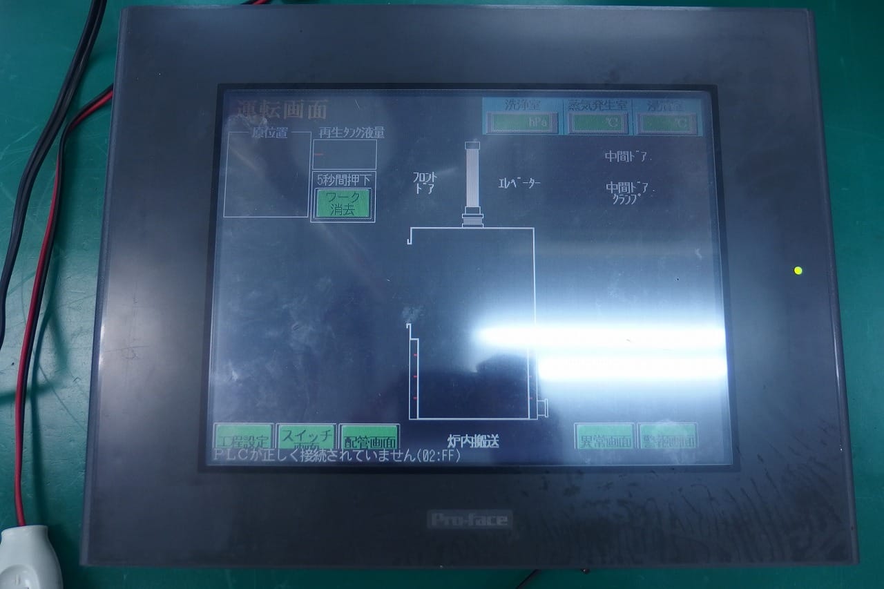 Proface製プログラム表示器の修理をご依頼いただきました。 電源を入れても、画面が表示されないとのことです。 早速、お預かりして、状態を確認します。 確かに起動はしている感じですが、表示がされません。 よくあるパターンなので、暗室にもっていき、再び起動します。 表示されていない画面をLEDライトで照らすと、表示されるべき画面が浮かび上がってきます。 バックライトが点灯していないことを疑い調査を進めます。