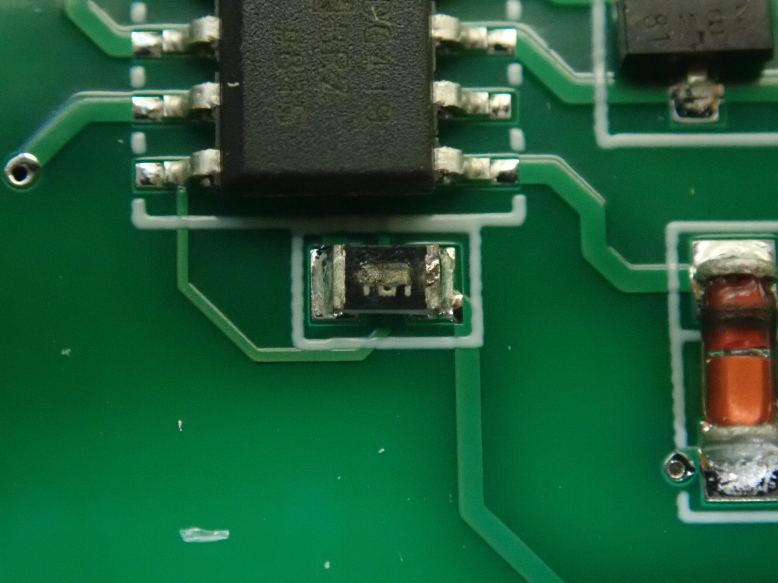 落雷の影響を受けていることから、配線が接続されるコネクタ周辺から目視調査を始めます。 ほどなくして、焼損している抵抗が確認されました。 周辺の部品(IC・抵抗・ダイオード)もテスタでチェックします。 いくつかの部品に異常が見られたために、インターフェイス回路の大部分を新品に換装しました。